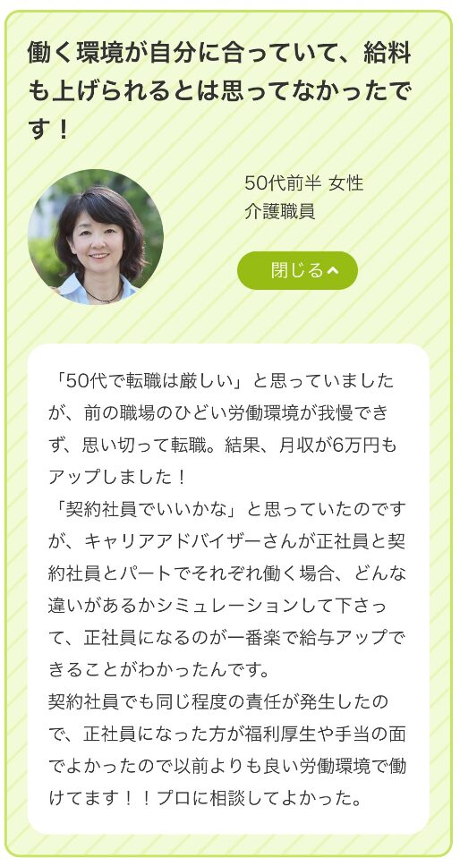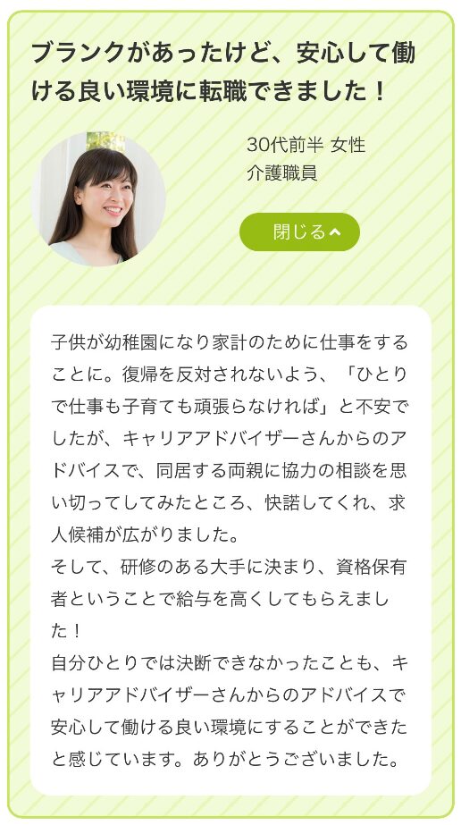 また、介護専門のアドバイザーに相談できるので、職場の雰囲気や人間関係についても事前に把握してから応募することできます。