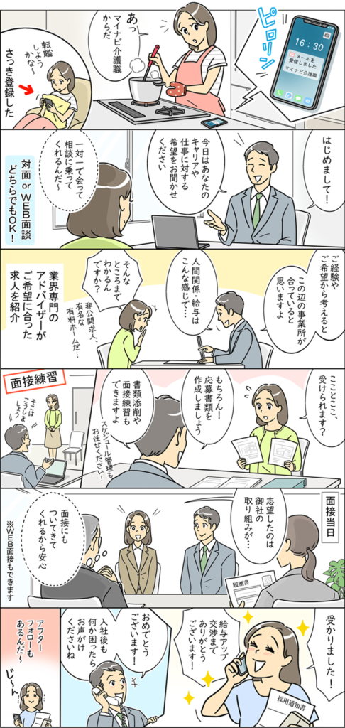 マイナビ介護職は、介護業界に精通したアドバイザーが求人紹介・書類作成・面接・内定までを全てサポートする無料の転職支援サービス。