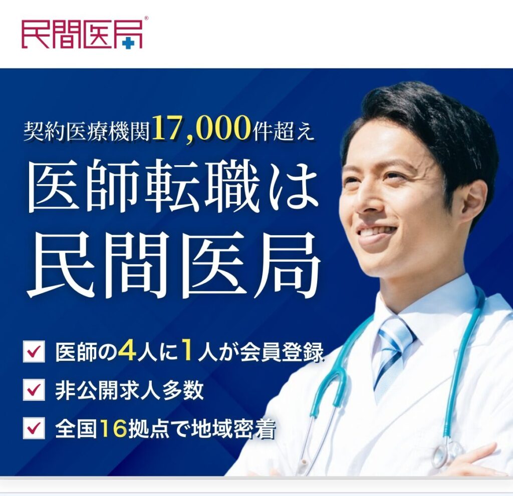 民間医局は、医師の4人に1人が会員登録している医師専門の求人紹介を主体とする会員登録制の総合サービス。