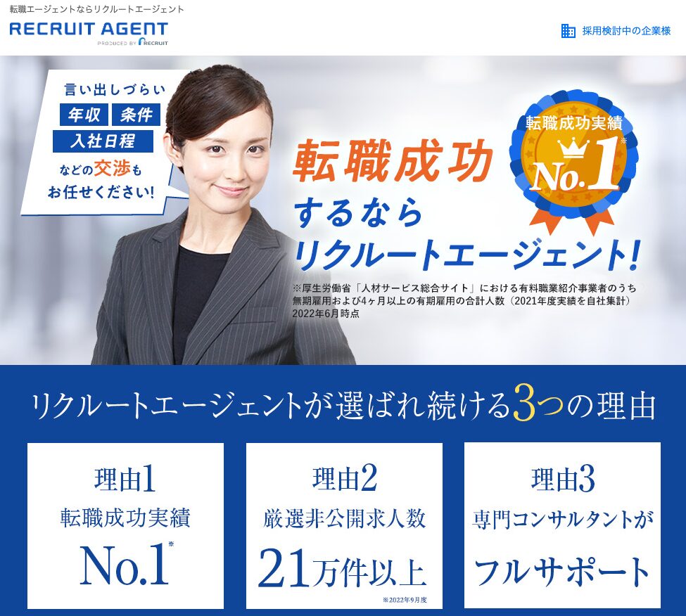 リクルートエージェントは、転職支援実績No.1として有名な人材サービス総合サイト。